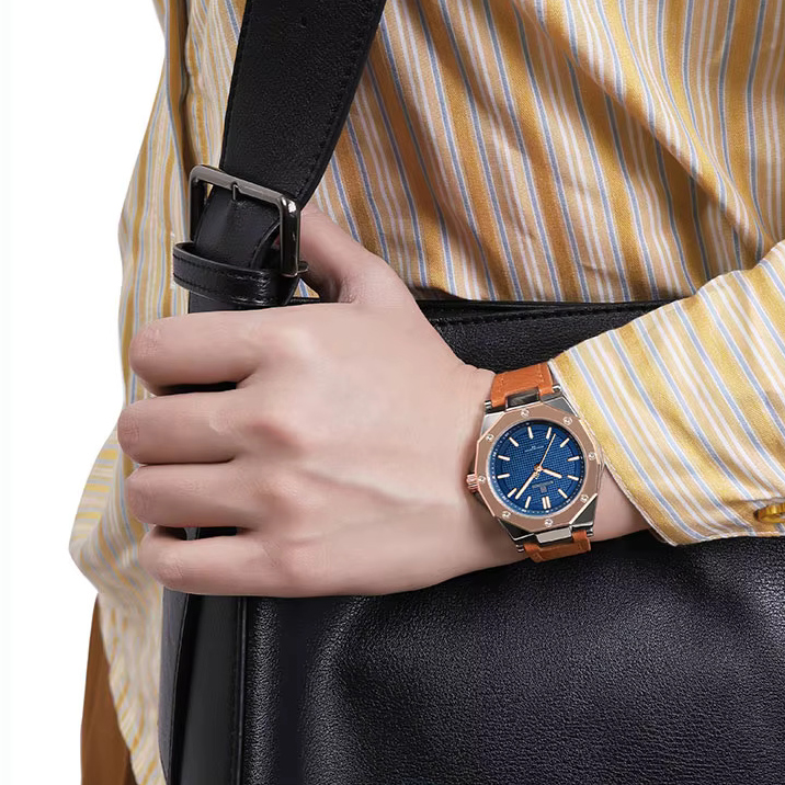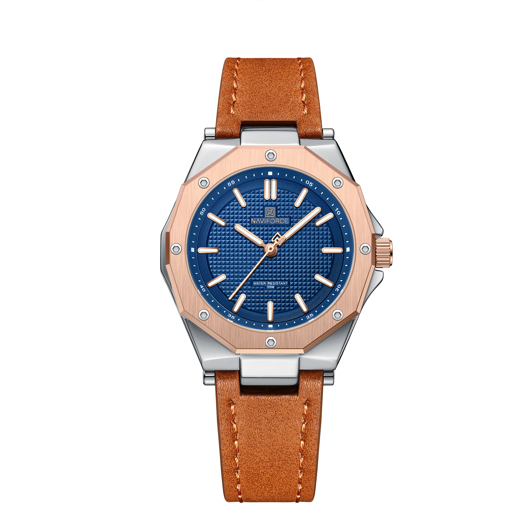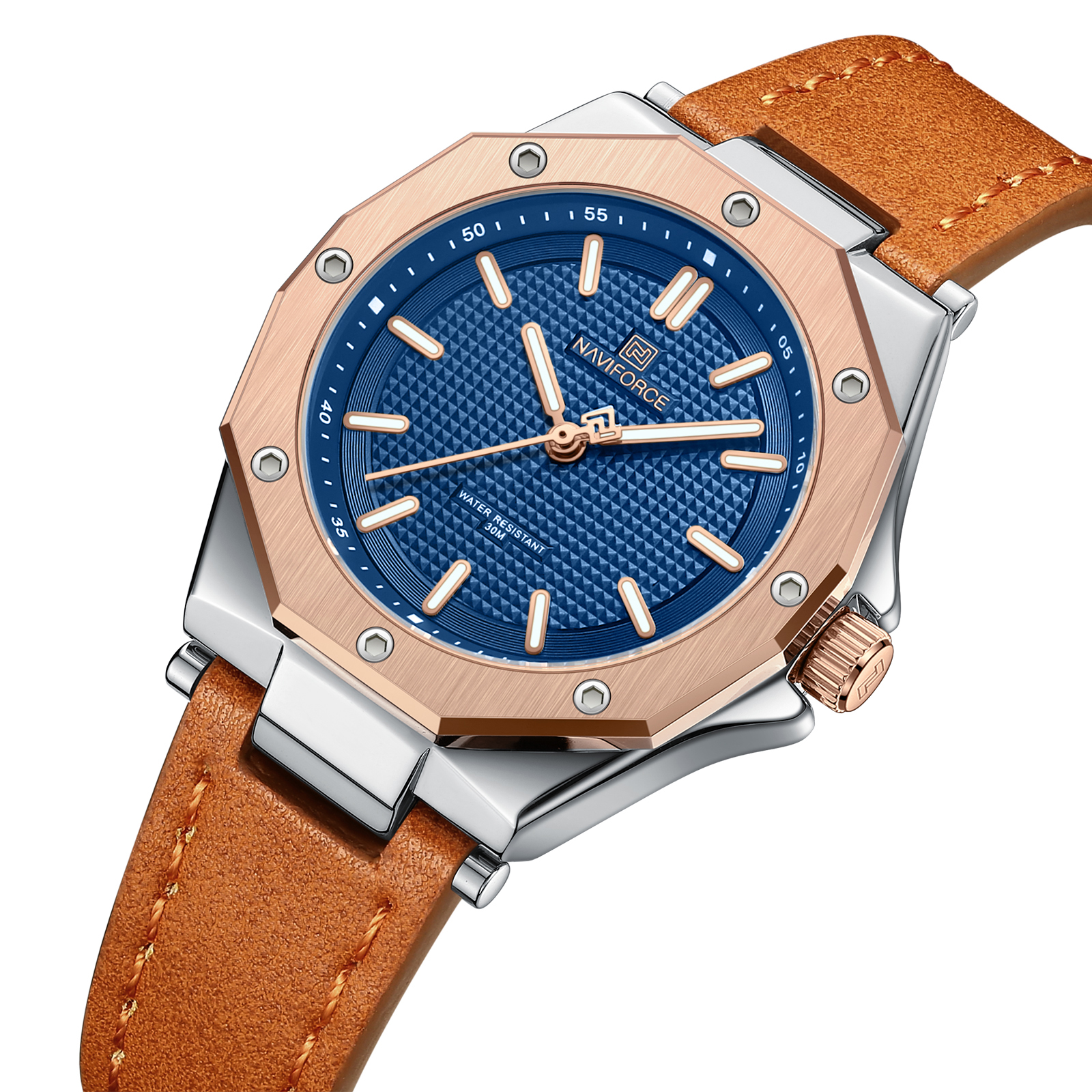 فرم چندضلعی صفحه ساعت زنانه نیوی فورس NF5026 بند چرم، باعث تمایز آن با مدل‌های معمولی بازار شده است و ظاهری مدرن و خاص به آن می‌بخشد.