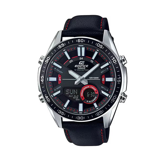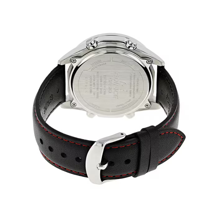 ساعت مچی مردانه کاسیو ادیفایس EFV-C100L-1AV با صفحه مشکی و قرمز و نمایش زمان دیجیتال و آنالوگ، همراه با بند چرمی مشکی، ظاهر اسپرت و جذابی به استایل شما میبخشد و قطعاً جزو گزینههای اصلی برای علاقهمندان به ساعتهای مردانه خواهد بود.